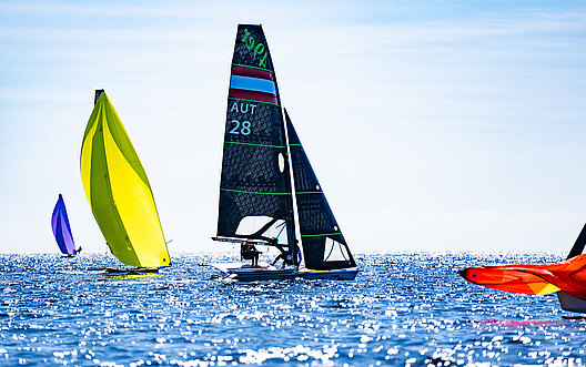 Österreichs einziger Nacra 17 bei dieser Weltmeisterschaft hat am ersten Tag der Goldflotte seinen Platz in den Top-10 verteidigt. Laura Farese und Matthäus Zöchling fuhren zu den Rängen sieben und zehn und liegen im Gesamtklassement an achter Stelle. „Es war der erste Tag Goldflotte, nur die besten 20 sind da bei. Die Linie war kürzer, der Kurs war kürzer – es war ein höheres Level. Jeder kleine Fehler wird bestraft und die Boote rundherum wissen, was sie tun“, sagt Vorschoter Zöchling. Seine Steuerfrau resümiert nach den ersten beiden Rennen in der Top-Gruppe: „Es war ein durchwachsener Tag mit ein paar falschen Entscheidungen und wir waren auch nicht super schnell. Aber es gibt noch viel Wettfahrten, also auf jeden Fall noch sehr viel möglich.“