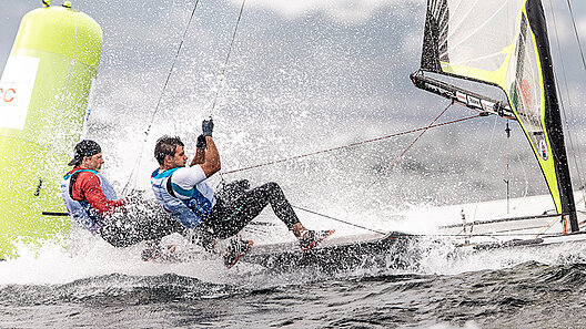 Nach einer Startverschiebung konnten die 470er-Herren heute sogar drei Wettfahrten durchführen. Bei 20 bis 25 Knoten erwischten David Bargehr und Lukas Mähr in den ersten beiden Rennen jeweils einen guten Start und landeten schlussendlich auf den Rängen sieben und sechs. „Es war eine gute Leistung, im zweiten Rennen haben wir sogar lange geführt. Der Wind hat aber stark gedreht und wir haben uns für Risikominimierung entschieden“, fasst Vorschoter Mähr zusammen. Nachdem der Start im letzten Rennen nicht mehr nach Wunsch verlief, holten die beiden Vorarlberger noch einige Boote auf und kamen an 14. Stelle ins Ziel. In der Gesamtwertung verbesserten sie sich auf Platz 13. Morgen sind wieder drei Wettfahrten geplant, derzeit fehlen dem Duo vom Yacht Club Bregenz 17 Punkte auf das am Sonntag ausgetragene Medal Race der zehn besten Boote. Das zweite österreichische 470er-Team Nikolaus Kampelmühler / Thomas Czajka verbesserte sich um einen Platz auf Rang 26.