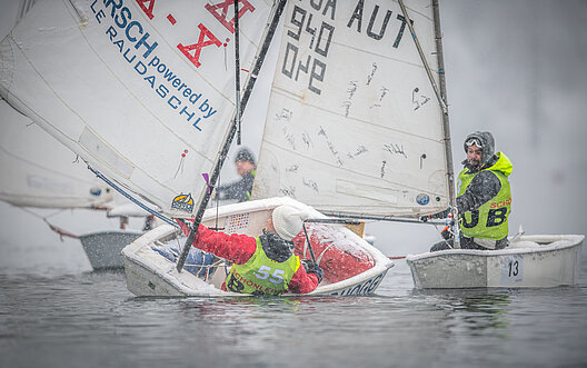 Unter dem Motto „Wir frieren uns für euch den Arsch ab!“ wagen sich rund 100 Teilnehmer*innen in winzige Kinderjollen der Klasse Optimist, die eigentlich für ein Seglergewicht bis 40 Kilogramm ausgelegt sind. Für die erwachsenen Teilnehmer wird das Rennen damit zu einem wackeligen Balanceakt zwischen Kälte, Kontrolle und purem Spaß.