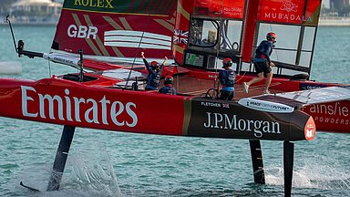 Tom Slingsby’s Flying Roos erwischten den besten Start, verloren aber entscheidend an Höhe, als sie von den Foils fielen. Die Black Foils übernahmen, bauten einen komfortablen Vorsprung auf – doch Emirates GBR wählte auf der letzten Kreuz das gegenüberliegende Gate und segelte damit zum goldrichtigen Moment in Führung.