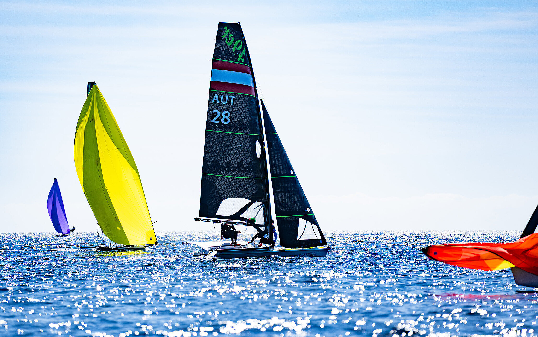 Keanu Prettner und Jakob Flachberger haben sich am zweiten Tag der 49er-Konkurrenz um fünf Plätze verbessert: Das Duo vom Union Yacht Club Wolfgangsee erreichte bei Leichtwindbedingungen die Einzelresultate vier, fünf und zwölf und kletterte auf Rang 13. „Es war heute sehr ähnlich wie gestern – wir hatten wieder zwei gute Wettfahrten und eine schwächere. Die Konstanz ist demnach noch etwas ausbaufähig. Aber wir haben auch gesehen, dass wir in der Lage sind, uns aus schwierigen Situationen erfolgreich zu befreien. Wir sind somit mit der Leistung über die ersten beiden Regattatage zufrieden“, berichtet Vorschoter Jakob Flachberger.