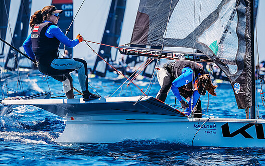 Sonnenschein, etwa 20 Grad Celsius und Leichtwindverhältnisse – so präsentierte sich der erste Wettkampftag bei der „Semaine Olympique Française“ an der Côte d’Azur. In diesen Bedingungen fand sich aus heimischer Sicht das 49erFX-Gespann Rosa Donner und Marion LaFrance-Berger (7/(13)/3) am besten zurecht. Das erst seit Ende Herbst letzten Jahres miteinander segelnde Duo beendete den ersten Tag an hervorragender vierter Stelle. „Wir haben uns hier vom ersten Moment an sehr wohl gefühlt und sind nach starken Trainingsergebnissen mit viel Selbstvertrauen in diese Regatta gestartet. Und wir haben unser Momentum mitgenommen: Wir waren schnell, hatten einen guten Rhythmus – und mit unserem ersten gemeinsamen Podestplatz einen sehr guten Tag. Wir sind sehr glücklich und zufrieden über diesen sensationellen Auftakt und freuen uns auf den weiteren Verlauf“, richtet Vorschoterin Marion LaFrance Berger aus.