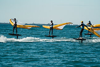 Ein typischer Tag im Wingfoil Lab begann früh mit einer professionellen Morning-Gym-Session, gefolgt von intensiven Wassereinheiten von bis zu fünf Stunden bei idealen Windbedingungen zwischen 6 und 18 Knoten. Nachmittags folgten Meteo-Workshops und Brainstorming-Sessions, bei denen die getesteten Formate analysiert und weiterentwickelt wurden.