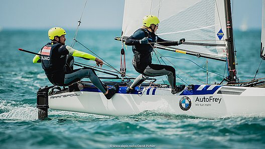 Bei Großteils leichten thermischen Winden segelte das Nacra 17-Duo mit zwei Top-10 Plätzen aus drei Rennen (13/7/5) auf den achten Platz im Zwischenklassement. Doch Thomas Zajac und Barbara Matz mussten nach dem letzten Lauf noch etwas zittern, legte doch ein Team aufgrund einer „Beinahe-Kollision“ Protest gegen das OeSV-Boot ein, der allerdings abgewendet werden konnte. „Es war heute ein schwieriger Tag. In den ersten beiden Rennen hatten wir noch wenig Wind, erst beim dritten Lauf kam ein richtig schöner Wind. Wir konnten eine gute Geschwindigkeit aufbauen, bei den Ergebnissen gab es allerdings Höhen und Tiefen. Wir sind sehr froh, dass wir uns insgesamt verbessern konnten. Unser klares Ziel sind die Top-10,“ zeigt sich Steuermann Thomas Zajac motiviert. Dazu muss das Nacra 17-Duo noch einmal alles abrufen, beträgt ihr Vorsprung auf den elften Platz doch lediglich fünf Punkte.