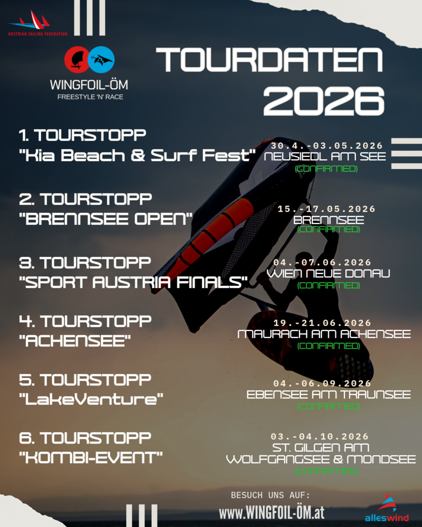 6 Tourstopps bilden die Wingfoil ÖM 2026. Wer die meisten Punkte aus 4 Stopps erreicht, wird Österreichischer Meister 2026!