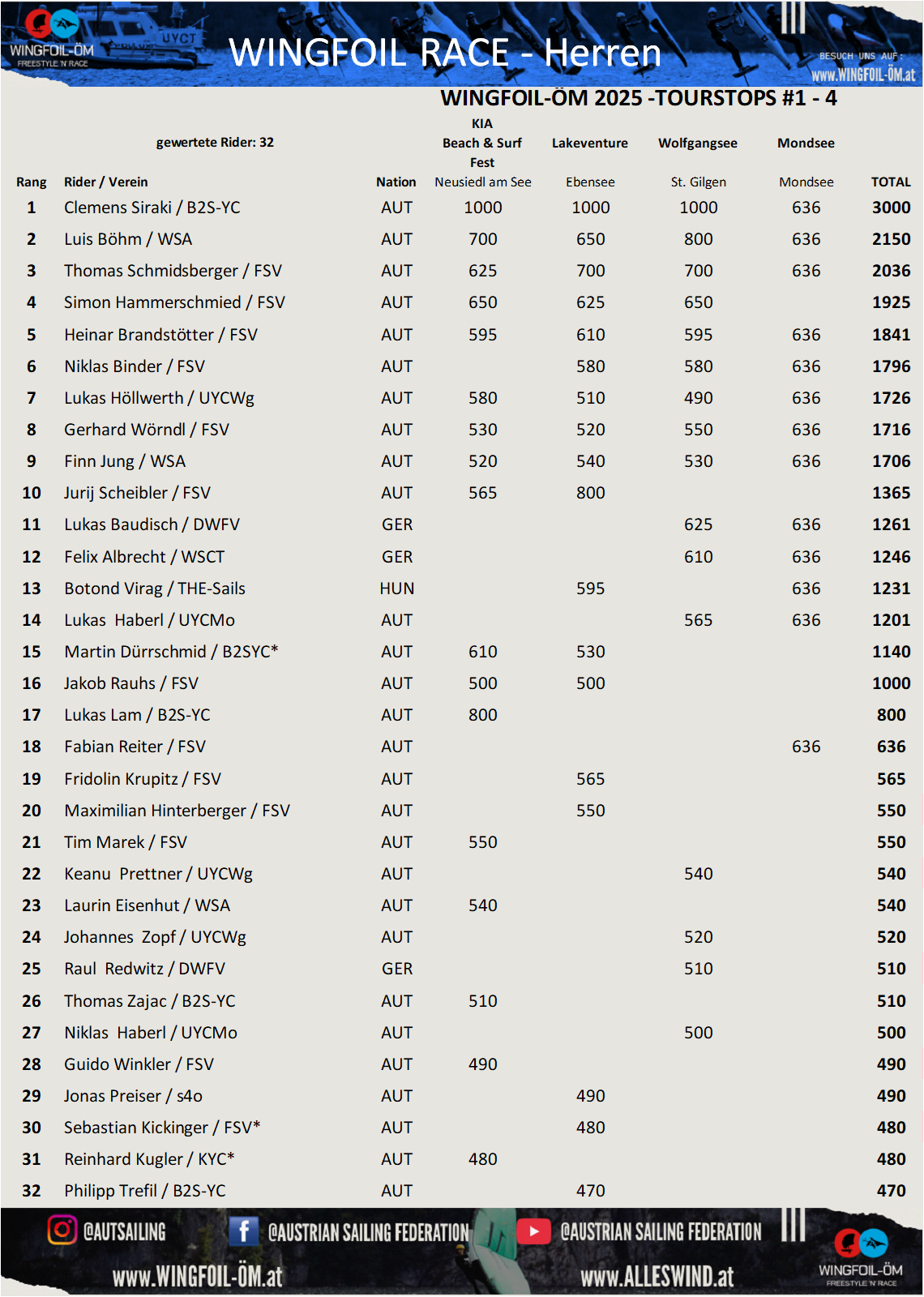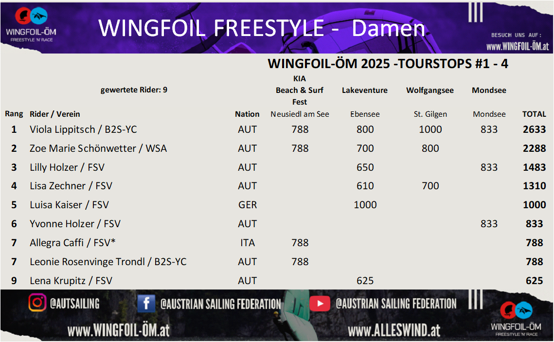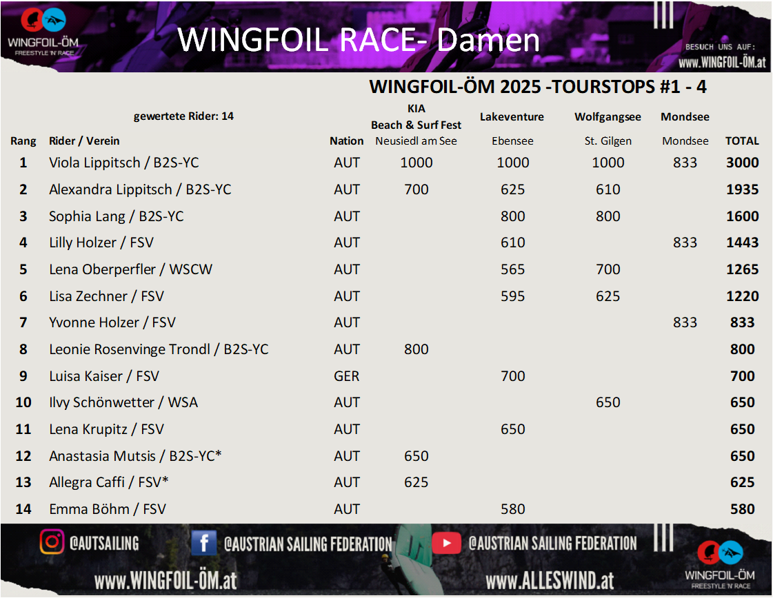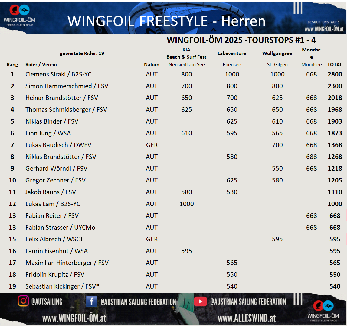 4 Tourstopps bilden die Wingfoil ÖM 2025. Wer die meisten Punkte aus 3 Stopps erreicht, wird Österreichischer Meister 2025 in der Klasse: